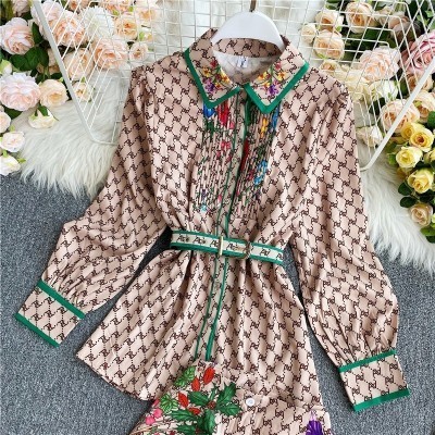 Fashion Vintage Two Piece Set 2022 Summer Turn Down Collar Long Sleeves Blouse Lady Tops+ Shorts Wom